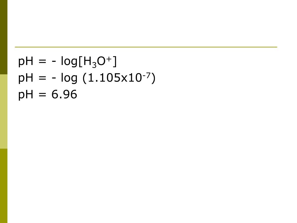 pH = - log[H3O+] pH = - log (1.105x10-7) pH = 6.96