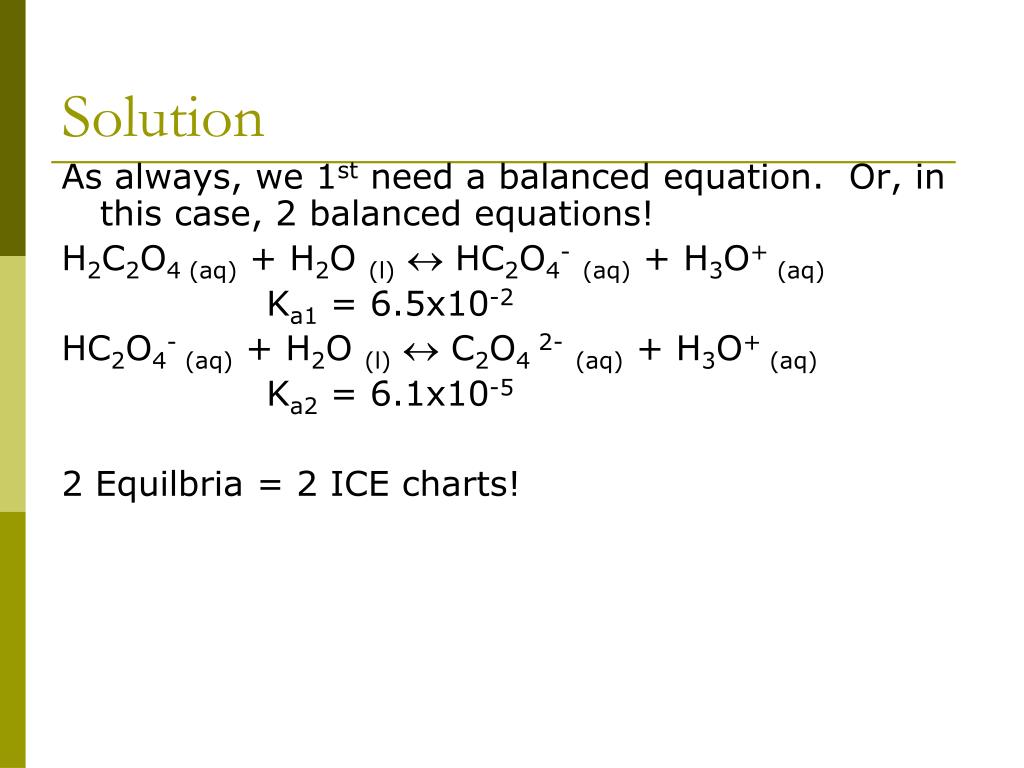 Solution As always, we 1st need a balanced equation. Or, in this case, 2 balanced equations! H2C2O4 (aq) + H2O (l) HC2O4-(aq) + H3O+ (aq) Ka1 = 6.5x10-2 HC2O4- (aq) + H2O (l)C2O42-(aq) + H3O+ (aq) Ka2 = 6.1x10-5 2 Equilbria = 2 ICE charts!