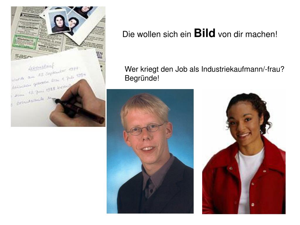Die wollen sich ein Bild von dir machen!. Wer kriegt den Job als Industriekaufmann/-frau? Begründe!. Das Bewerbungsfoto Den Eindruck, den dein Foto hinterlässt, solltest du nicht unterschätzen. Hier ein paar Tipps: Lasse ein aktuelles Foto beim Fotografen machen.