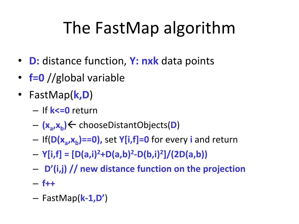 The FastMap algorithm • D: distance function, Y: nxk data points • f=0 //global variable • FastMap(k,D) • If k<=0 return • (xa,xb) chooseDistantObjects(D) • If(D(xa,xb)==0), set Y[i,f]=0 for every i and return • Y[i,f] = [D(a,i)2+D(a,b)2-D(b,i)2]/(2D(a,b)) • D’(i,j) // new distance function on the projection • f++ • FastMap(k-1,D’)