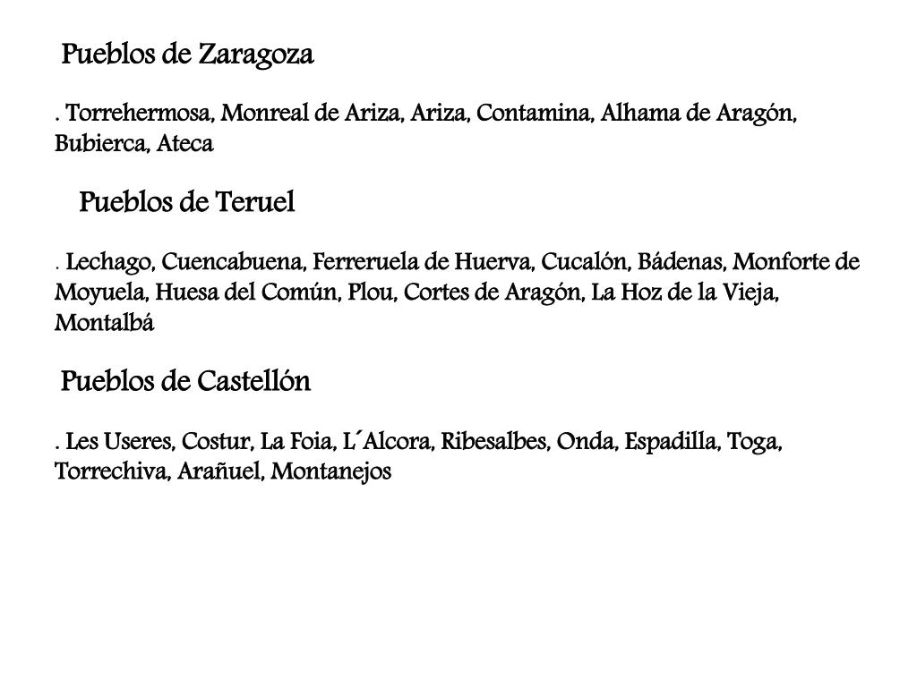 Pueblos de Zaragoza . Torrehermosa, Monreal de Ariza, Ariza, Contamina, Alhama de Aragón, Bubierca, Ateca Pueblos de Teruel . Lechago, Cuencabuena, Ferreruela de Huerva, Cucalón, Bádenas, Monforte de Moyuela, Huesa del Común, Plou, Cortes de Aragón, La Hoz de la Vieja, Montalbá Pueblos de Castellón . Les Useres, Costur, La Foia, L´Alcora, Ribesalbes, Onda, Espadilla, Toga, Torrechiva, Arañuel, Montanejos