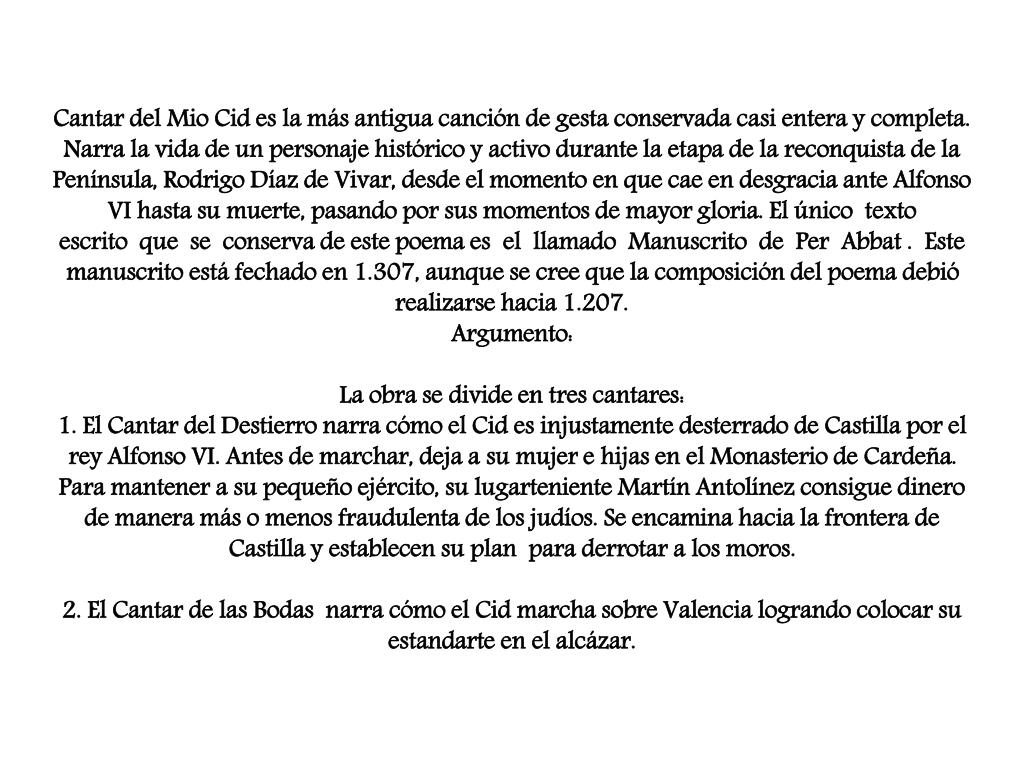 Cantar del Mio Cid es la más antigua canción de gesta conservada casi entera y completa. Narra la vida de un personaje histórico y activo durante la etapa de la reconquista de la Península, Rodrigo Díaz de Vivar, desde el momento en que cae en desgracia ante Alfonso VI hasta su muerte, pasando por sus momentos de mayor gloria. El único texto escrito que se conserva de este poema es el llamado Manuscrito de Per Abbat . Este manuscrito está fechado en 1.307, aunque se cree que la composición del poema debió realizarse hacia 1.207. Argumento:La obra se divide en tres cantares: 1. El Cantar del Destierro narra cómo el Cid es injustamente desterrado de Castilla por el rey Alfonso VI. Antes de marchar, deja a su mujer e hijas en el Monasterio de Cardeña. Para mantener a su pequeño ejército, su lugarteniente Martín Antolínez consigue dinero de manera más o menos fraudulenta de los judíos. Se encamina hacia la frontera de Castilla y establecen su plan para derrotar a los moros.2. El Cantar de las Bodas narra cómo el Cid marcha sobre Valencia logrando colocar su estandarte en el alcázar.