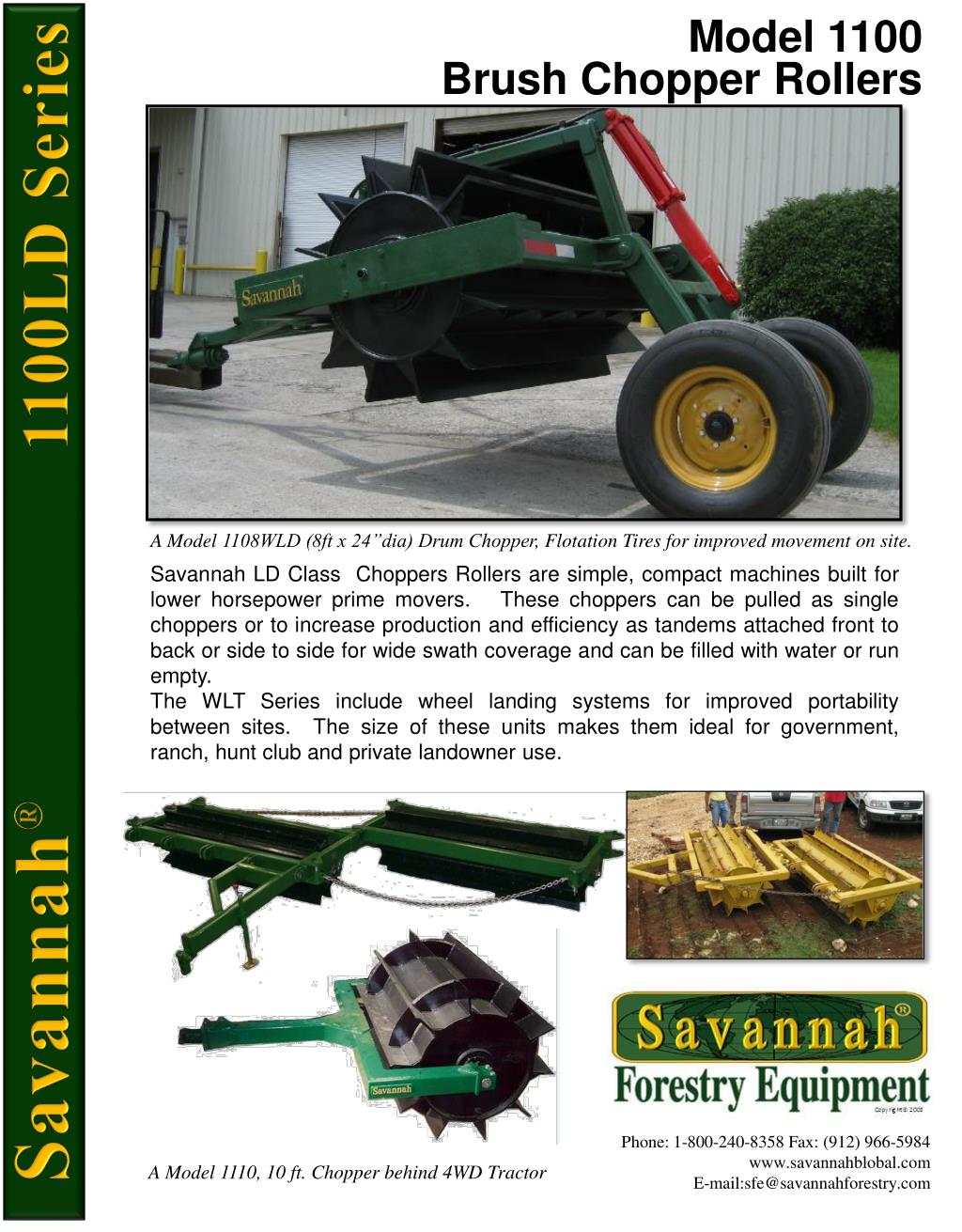 Model 1100 Brush Chopper Rollers 1100LD Series A Model 1108WLD (8ft x 24”dia) Drum Chopper, Flotation Tires for improved movement on site. Savannah LD Class Choppers Rollers are simple, compact machines built for lower horsepower prime movers. These choppers can be pulled as single choppers or to increase production and efficiency as tandems attached front to back or side to side for wide swath coverage and can be filled with water or run empty. The WLT Series include wheel landing systems for improved portability between sites. The size of these units makes them ideal for government, ranch, hunt club and private landowner use. ® Savannah Phone: 1-800-240-8358 Fax: (912) 966-5984 www.savannahblobal.com E-mail:sfe@savannahforestry.com A Model 1110, 10 ft. Chopper behind 4WD Tractor