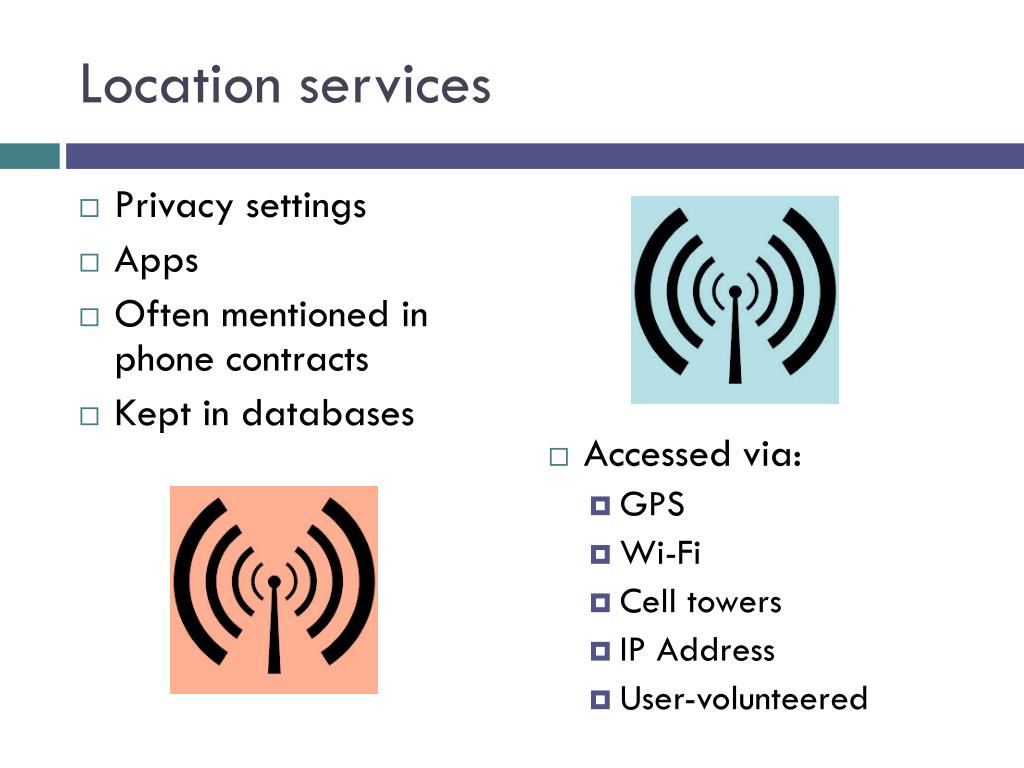 Location services • Privacy settings • Apps • Often mentioned in phone contracts • Kept in databases • Accessed via: • GPS • Wi-Fi • Cell towers • IP Address • User-volunteered