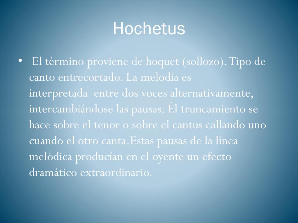 Hochetus • El término proviene de hoquet (sollozo). Tipo de canto entrecortado. La melodía es interpretada entre dos voces alternativamente, intercambiándose las pausas. Él truncamiento se hace sobre el tenor o sobre el cantus callando uno cuando el otro canta.Estas pausas de la línea melódica producían en el oyente un efecto dramático extraordinario.