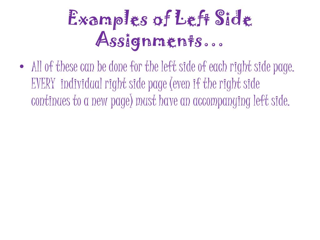 Examples of Left Side Assignments… • All of these can be done for the left side of each right side page. EVERY individual right side page (even if the right side continues to a new page) must have an accompanying left side.