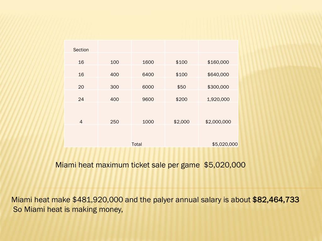 Miami heat maximum ticket sale per game $5,020,000 Miami heat make $481,920,000 and the palyer annual salary is about $82,464,733 So Miami heat is making money,