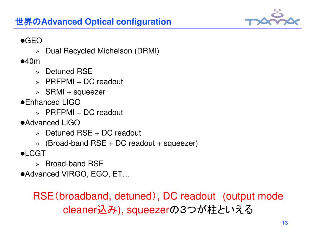 世界のAdvanced Optical configuration • GEO • Dual Recycled Michelson (DRMI) • 40m • Detuned RSE • PRFPMI + DC readout • SRMI + squeezer • Enhanced LIGO • PRFPMI + DC readout • Advanced LIGO • Detuned RSE + DC readout • (Broad-band RSE + DC readout + squeezer) • LCGT • Broad-band RSE • Advanced VIRGO, EGO, ET… RSE(broadband, detuned), DC readout(output mode cleaner込み), squeezerの3つが柱といえる