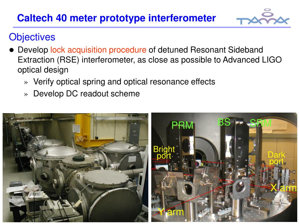 BS SRM PRM Bright port Dark port X arm Y arm Caltech 40 meter prototype interferometer Objectives • Develop lock acquisition procedure of detuned Resonant Sideband Extraction (RSE) interferometer, as close as possible to Advanced LIGO optical design • Verify optical spring and optical resonance effects • Develop DC readout scheme