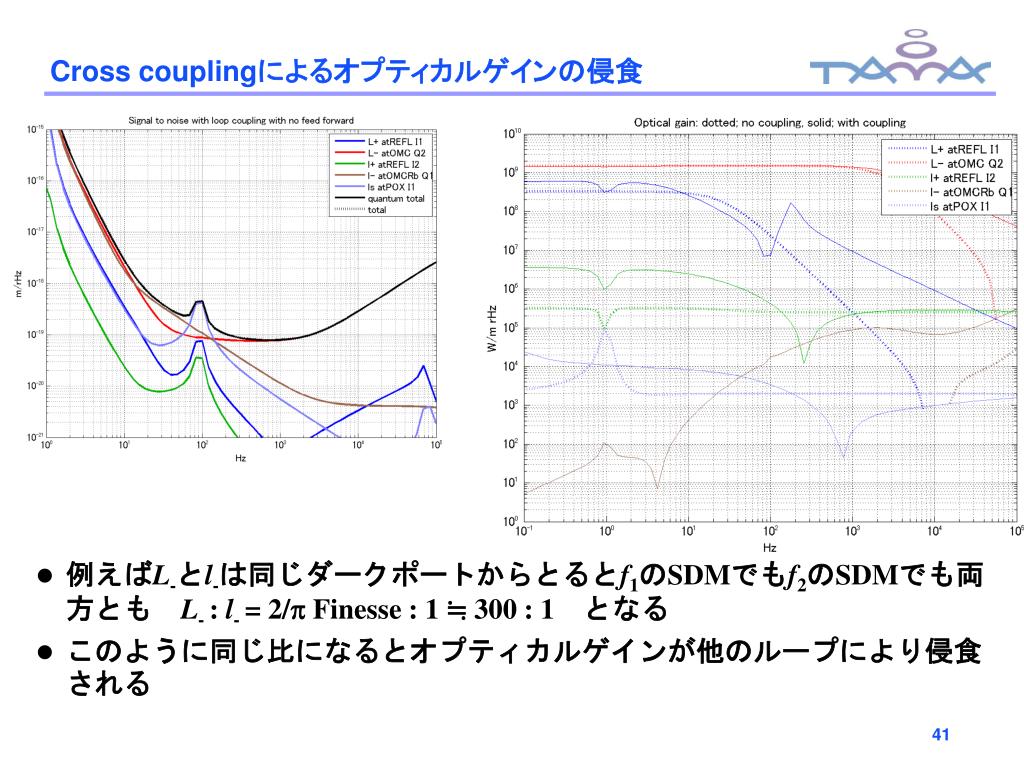 Cross couplingによるオプティカルゲインの侵食 • 例えばL-とl-は同じダークポートからとるとf1のSDMでもf2のSDMでも両方とも L- : l- = 2/p Finesse : 1 ≒ 300 : 1 となる • このように同じ比になるとオプティカルゲインが他のループにより侵食される