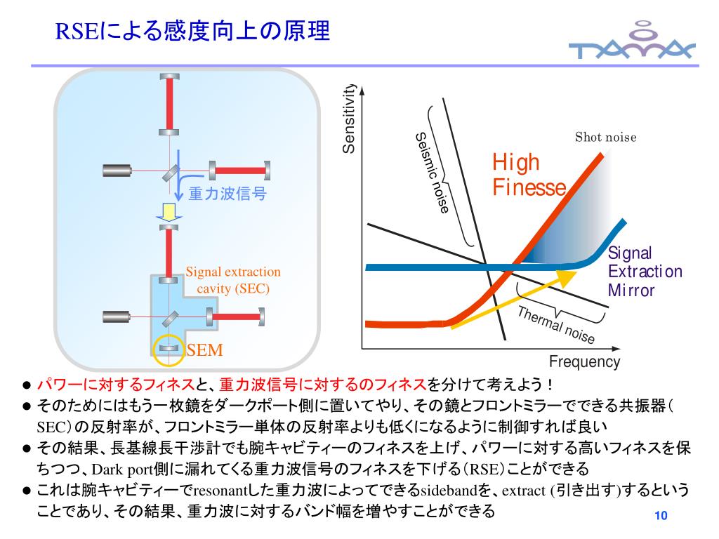 RSEによる感度向上の原理 • パワーに対するフィネスと、重力波信号に対するのフィネスを分けて考えよう! • そのためにはもう一枚鏡をダークポート側に置いてやり、その鏡とフロントミラーでできる共振器(SEC)の反射率が、フロントミラー単体の反射率よりも低くになるように制御すれば良い • その結果、長基線長干渉計でも腕キャビティーのフィネスを上げ、パワーに対する高いフィネスを保ちつつ、Dark port側に漏れてくる重力波信号のフィネスを下げる(RSE)ことができる • これは腕キャビティーでresonantした重力波によってできるsidebandを、extract (引き出す)するということであり、その結果、重力波に対するバンド幅を増やすことができる 重力波信号 Signal extraction cavity (SEC) SEM