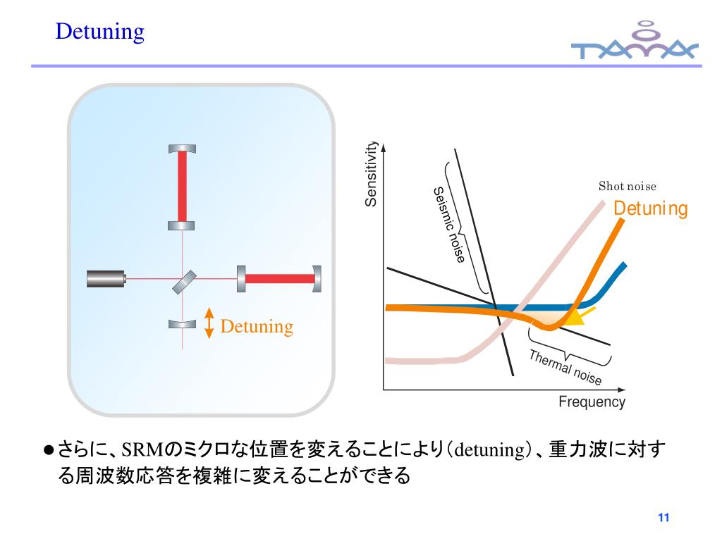 Detuning • さらに、SRMのミクロな位置を変えることにより(detuning)、重力波に対する周波数応答を複雑に変えることができる