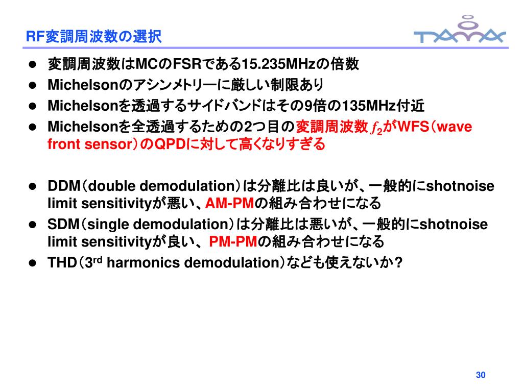 RF変調周波数の選択 • 変調周波数はMCのFSRである15.235MHzの倍数 • Michelsonのアシンメトリーに厳しい制限あり • Michelsonを透過するサイドバンドはその9倍の135MHz付近 • Michelsonを全透過するための2つ目の変調周波数 f2がWFS(wave front sensor)のQPDに対して高くなりすぎる • DDM(double demodulation)は分離比は良いが、一般的にshotnoise limit sensitivityが悪い、AM-PMの組み合わせになる • SDM(single demodulation)は分離比は悪いが、一般的にshotnoise limit sensitivityが良い、 PM-PMの組み合わせになる • THD(3rd harmonicsdemodulation)なども使えないか?