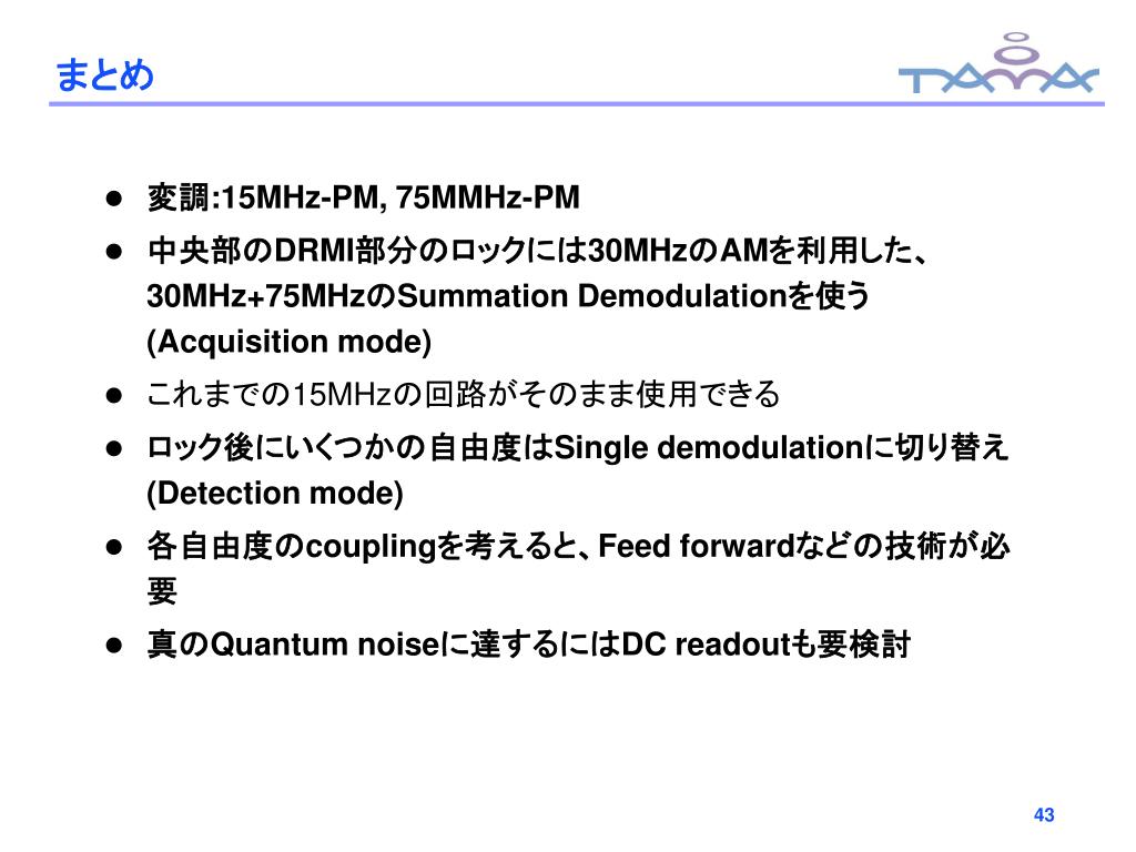 まとめ • 変調:15MHz-PM, 75MMHz-PM • 中央部のDRMI部分のロックには30MHzのAMを利用した、30MHz+75MHzのSummation Demodulationを使う (Acquisition mode) • これまでの15MHzの回路がそのまま使用できる • ロック後にいくつかの自由度はSingle demodulationに切り替え (Detection mode) • 各自由度のcouplingを考えると、Feed forwardなどの技術が必要 • 真のQuantum noiseに達するにはDC readoutも要検討
