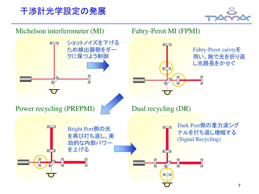 干渉計光学設定の発展 Michelson interferometer (MI) Fabry-Perot MI (FPMI) Power recycling (PRFPMI) Dual recycling (DR) ショットノイズを下げるため検出器側をダークに保つよう制御 Fabry-Perot caivtyを用い、腕で光を折り返し光路長をかせぐ Dark Port側の重力波シグナルを打ち返し増幅する(Signal Recycling) Bright Port側の光を再び打ち返し、実効的な内部パワーを上げる