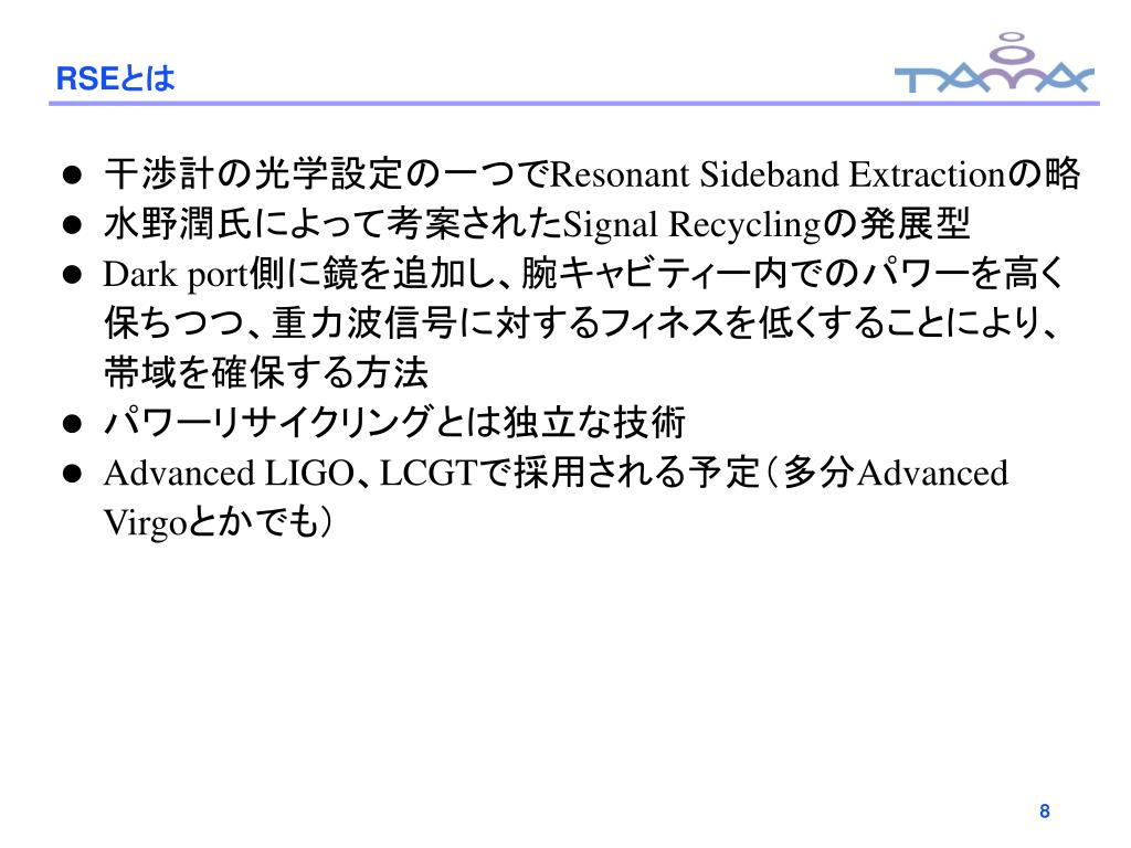 RSEとは • 干渉計の光学設定の一つでResonant Sideband Extractionの略 • 水野潤氏によって考案されたSignal Recyclingの発展型 • Dark port側に鏡を追加し、腕キャビティー内でのパワーを高く保ちつつ、重力波信号に対するフィネスを低くすることにより、帯域を確保する方法 • パワーリサイクリングとは独立な技術 • Advanced LIGO、LCGTで採用される予定(多分Advanced Virgoとかでも)