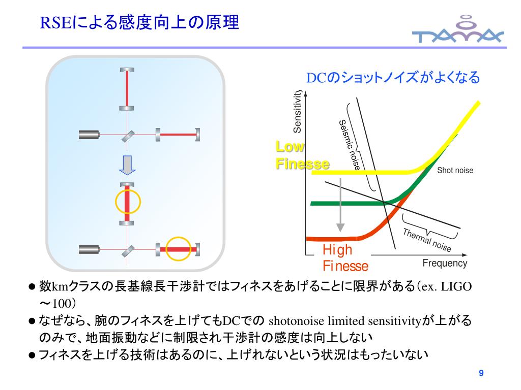 RSEによる感度向上の原理 DCのショットノイズがよくなる • 数kmクラスの長基線長干渉計ではフィネスをあげることに限界がある(ex. LIGO~100) • なぜなら、腕のフィネスを上げてもDCでの shotonoise limited sensitivityが上がるのみで、地面振動などに制限され干渉計の感度は向上しない • フィネスを上げる技術はあるのに、上げれないという状況はもったいない Low Finesse