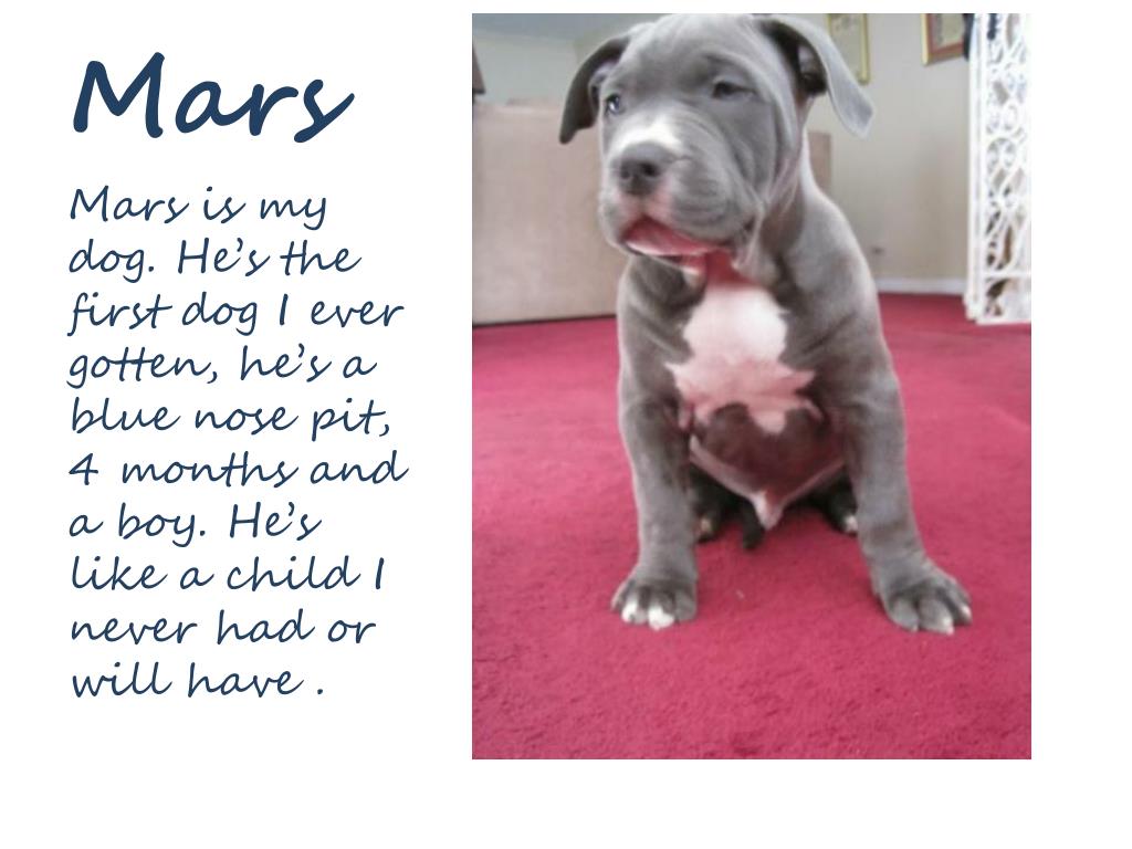 Mars Mars is my dog. He’s the first dog I ever gotten, he’s a blue nose pit, 4 months and a boy. He’s like a child I never had or will have .