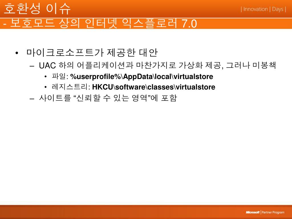 호환성 이슈 - 보호모드 상의 인터넷 익스플로러 7.0 • 마이크로소프트가 제공한 대안 • UAC 하의 어플리케이션과 마찬가지로 가상화 제공, 그러나 미봉책 • 파일: %userprofile%\AppData\local\virtualstore • 레지스트리: HKCU\software\classes\virtualstore • 사이트를 “신뢰할 수 있는 영역”에 포함