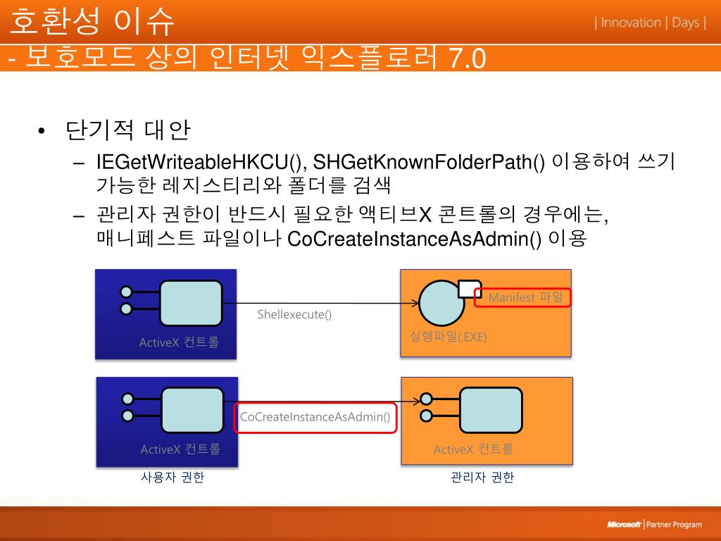 호환성 이슈 - 보호모드 상의 인터넷 익스플로러 7.0 • 단기적 대안 • IEGetWriteableHKCU(), SHGetKnownFolderPath() 이용하여 쓰기 가능한 레지스티리와 폴더를 검색 • 관리자 권한이 반드시 필요한 액티브X 콘트롤의 경우에는, 매니페스트 파일이나 CoCreateInstanceAsAdmin() 이용 Manifest 파일 Shellexecute() 실행파일(.EXE) ActiveX 컨트롤 CoCreateInstanceAsAdmin() ActiveX 컨트롤 ActiveX 컨트롤 사용자 권한 관리자 권한