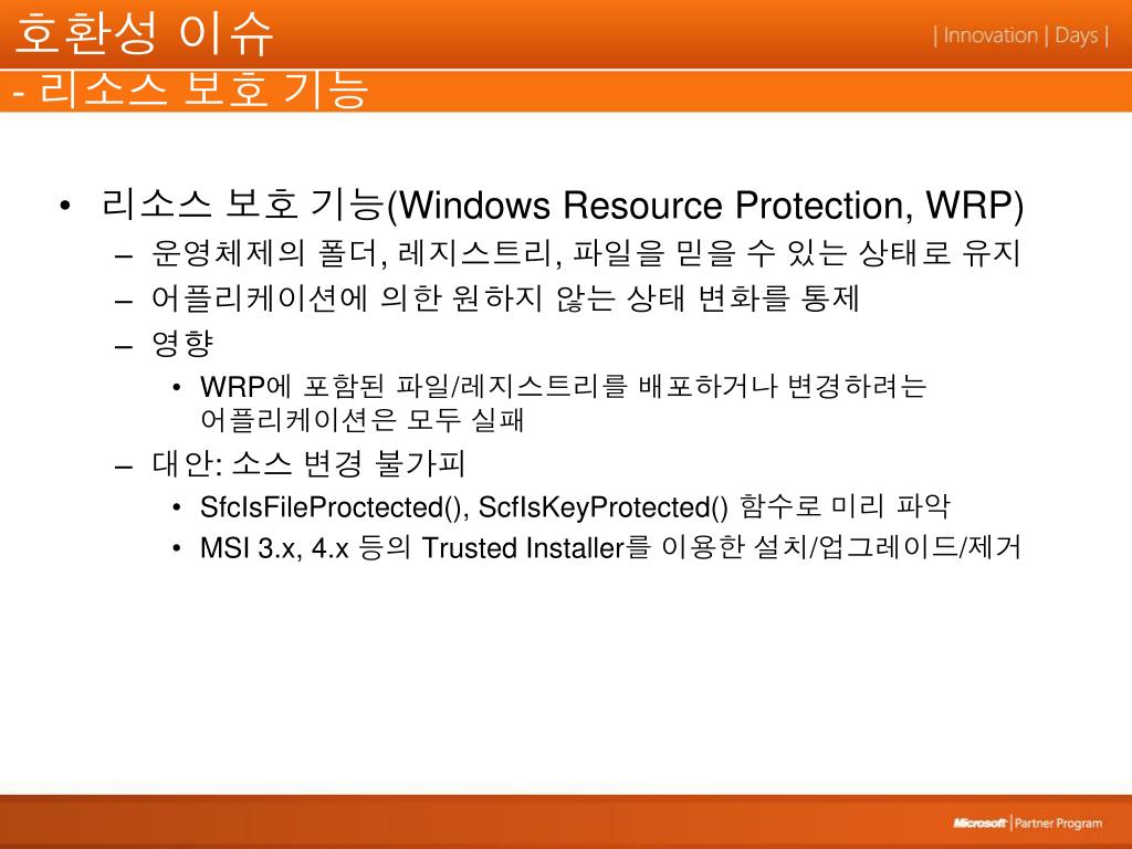 호환성 이슈 - 리소스 보호 기능 • 리소스 보호 기능(Windows Resource Protection, WRP) • 운영체제의 폴더, 레지스트리, 파일을 믿을 수 있는 상태로 유지 • 어플리케이션에 의한 원하지 않는 상태 변화를 통제 • 영향 • WRP에 포함된 파일/레지스트리를 배포하거나 변경하려는 어플리케이션은 모두 실패 • 대안: 소스 변경 불가피 • SfcIsFileProctected(), ScfIsKeyProtected() 함수로 미리 파악 • MSI 3.x, 4.x 등의 Trusted Installer를 이용한 설치/업그레이드/제거