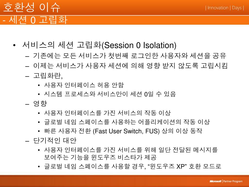 호환성 이슈 - 세션 0 고립화 • 서비스의 세션 고립화(Session 0 Isolation) • 기존에는 모든 서비스가 첫번째 로그인한 사용자와 세션을 공유 • 이제는 서비스가 사용자 세션에 의해 영향 받지 않도록 고립시킴 • 고립화란, • 사용자 인터페이스 허용 안함 • 시스템 프로세스와 서비스만이 세션 0일 수 있음 • 영향 • 사용자 인터페이스를 가진 서비스의 작동 이상 • 글로벌 네임 스페이스를 사용하는 어플리케이션의 작동 이상 • 빠른 사용자 전환 (Fast User Switch, FUS) 상의 이상 동작 • 단기적인 대안 • 사용자 인터페이스를 가진 서비스를 위해 일단 전달된 메시지를 보여주는 기능을 윈도우즈 비스타가 제공 • 글로벌 네임 스페이스를 사용할 경우, “윈도우즈 XP” 호환 모드로