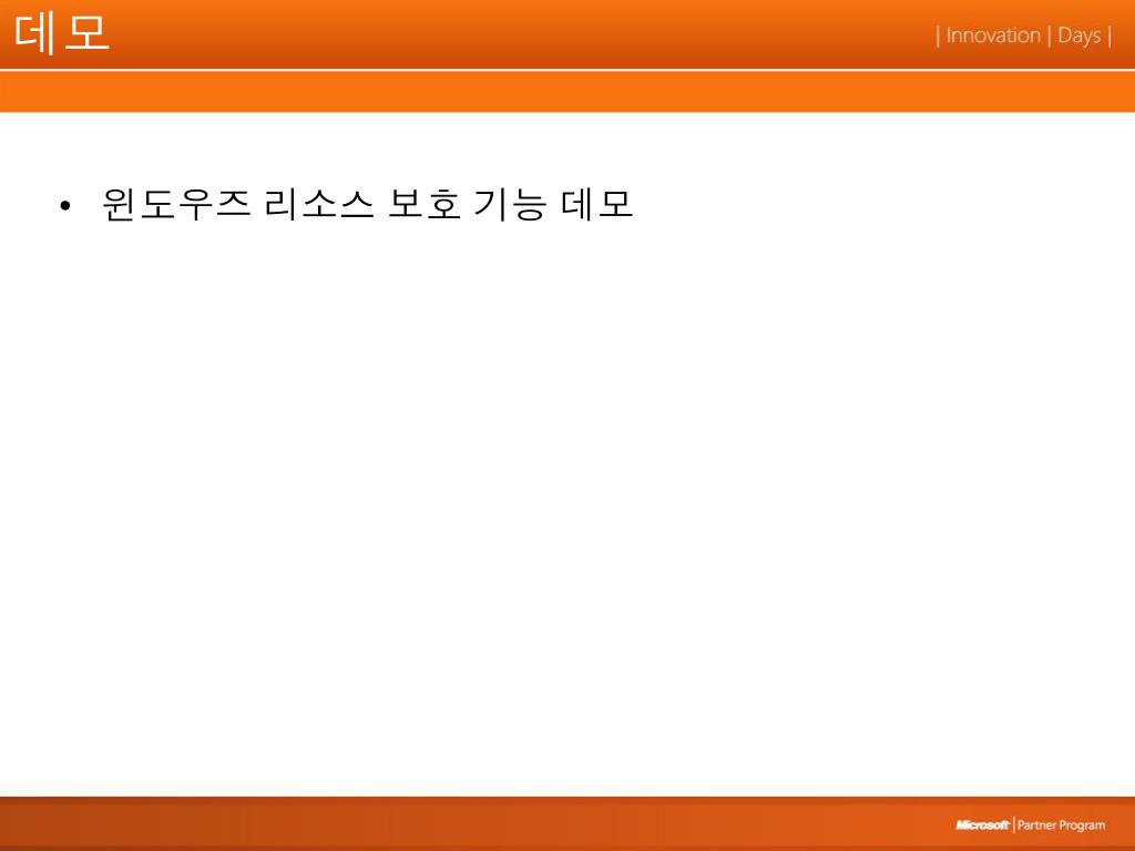 데모 - 사용자 계정 콘트롤 • 표준 사용자와 신뢰도 등급 • 권한 상승 • 메니페스 파일을 이용한 관리자 권한 마킹 • 파일 및 레지스트리 가상화