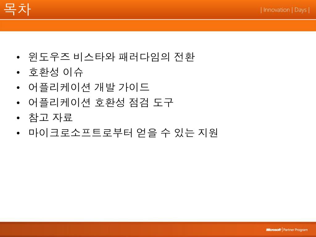 목차 • 윈도우즈 비스타와 패러다임의 전환 • 호환성 이슈 • 어플리케이션 개발 가이드 • 어플리케이션 호환성 점검 도구 • 참고 자료 • 마이크로소프트로부터 얻을 수 있는 지원