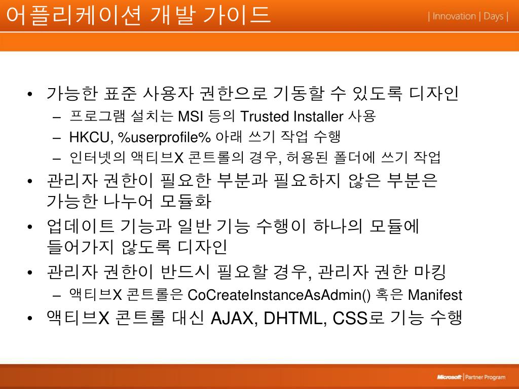 어플리케이션 개발 가이드 • 가능한 표준 사용자 권한으로 기동할 수 있도록 디자인 • 프로그램 설치는 MSI 등의 Trusted Installer 사용 • HKCU, %userprofile% 아래 쓰기 작업 수행 • 인터넷의 액티브X 콘트롤의 경우, 허용된 폴더에 쓰기 작업 • 관리자 권한이 필요한 부분과 필요하지 않은 부분은 가능한 나누어 모듈화 • 업데이트 기능과 일반 기능 수행이 하나의 모듈에 들어가지 않도록 디자인 • 관리자 권한이 반드시 필요할 경우, 관리자 권한 마킹 • 액티브X 콘트롤은 CoCreateInstanceAsAdmin() 혹은 Manifest • 액티브X 콘트롤 대신 AJAX, DHTML, CSS로 기능 수행