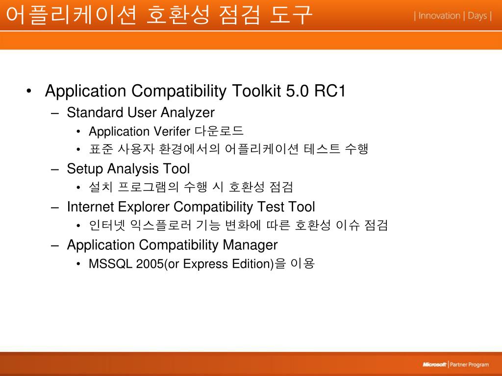 어플리케이션 호환성 점검 도구 • Application Compatibility Toolkit 5.0 RC1 • Standard User Analyzer • Application Verifer 다운로드 • 표준 사용자 환경에서의 어플리케이션 테스트 수행 • Setup Analysis Tool • 설치 프로그램의 수행 시 호환성 점검 • Internet Explorer Compatibility Test Tool • 인터넷 익스플로러 기능 변화에 따른 호환성 이슈 점검 • Application Compatibility Manager • MSSQL 2005(or Express Edition)을 이용
