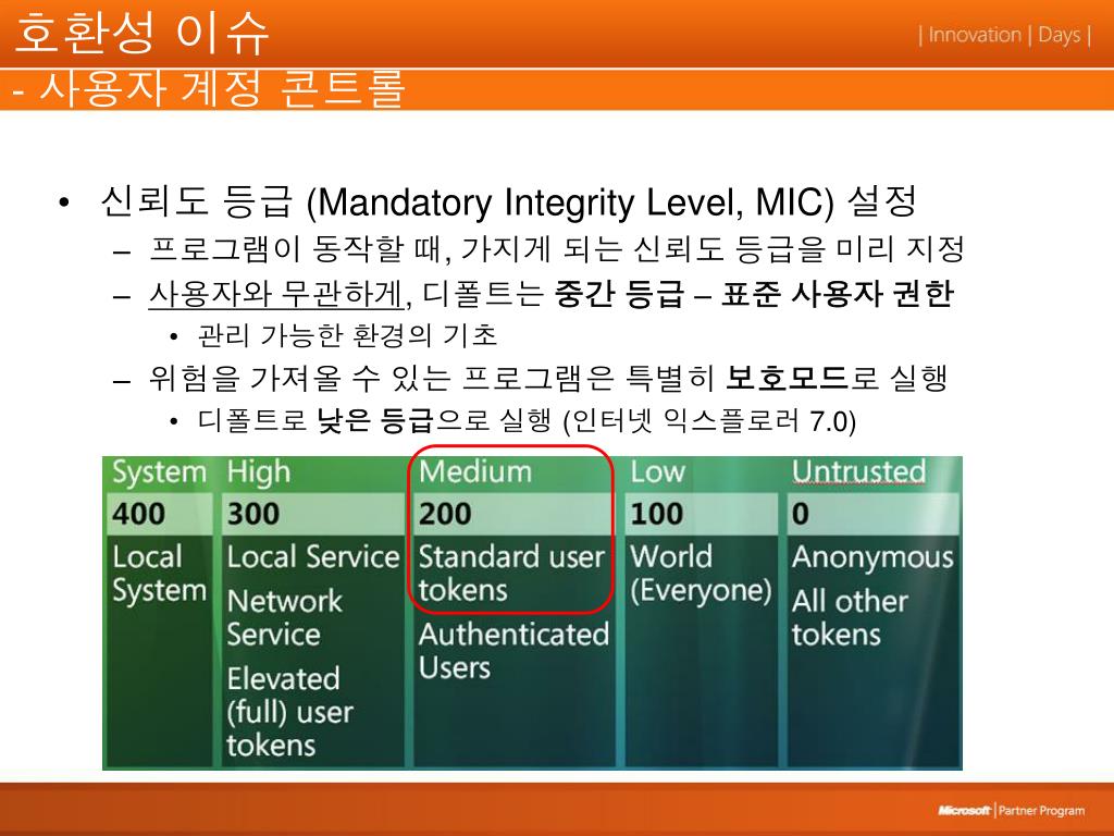 호환성 이슈 - 사용자 계정 콘트롤 • 신뢰도 등급 (Mandatory Integrity Level, MIC) 설정 • 프로그램이 동작할 때, 가지게 되는 신뢰도 등급을 미리 지정 • 사용자와 무관하게, 디폴트는 중간 등급 – 표준 사용자 권한 • 관리 가능한 환경의 기초 • 위험을 가져올 수 있는 프로그램은 특별히 보호모드로 실행 • 디폴트로 낮은 등급으로 실행 (인터넷 익스플로러 7.0)