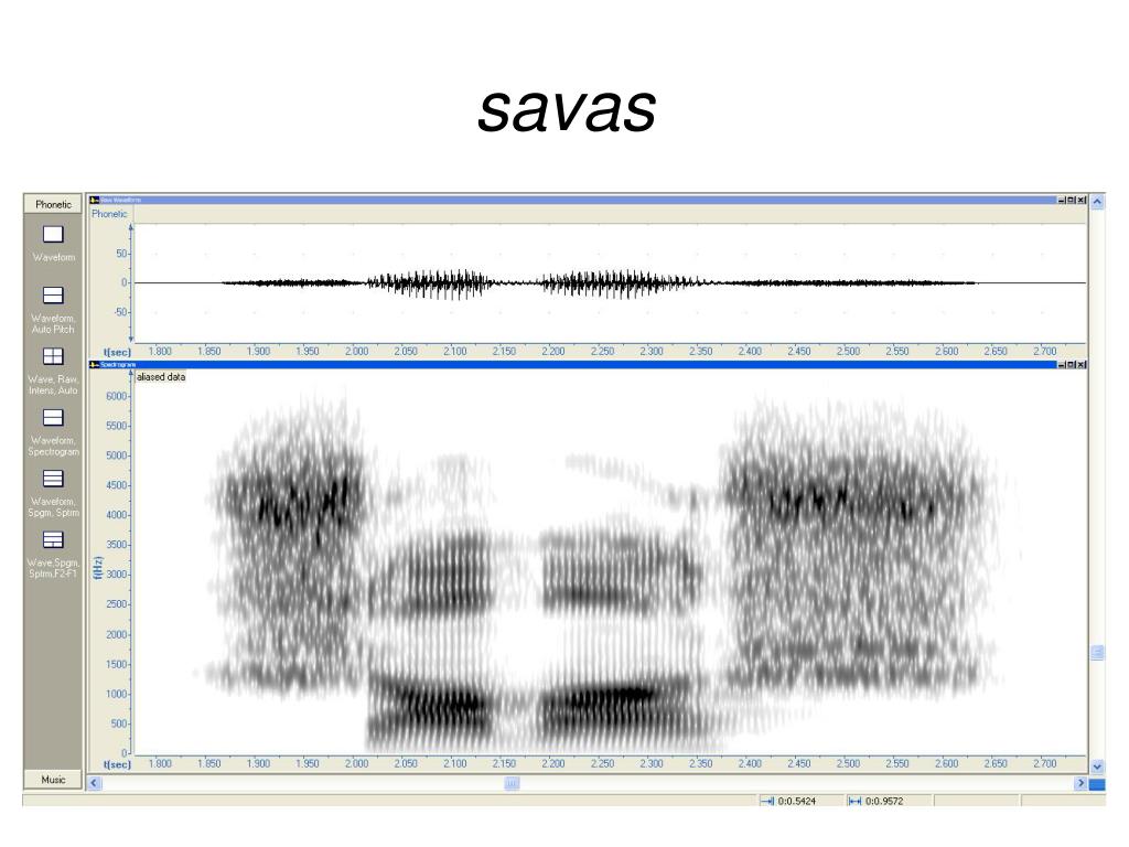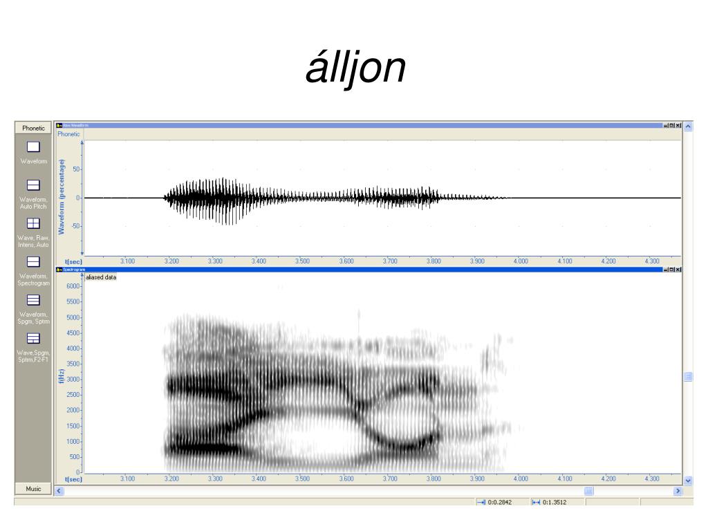 Akusztika – illusztrációk 2. Bevezetés a fonetikába. /l/: háló, hűlő. /ll/: halló, hüllő. Magánhangzós átmenet: kreál. /j/: hajó, tojás, álljon. hajó. tojás. álljon. /i/ és /j/: szíjja. /v/: sav, savas, vevő. sav. savas. vevő. nazális: benne. frázis.