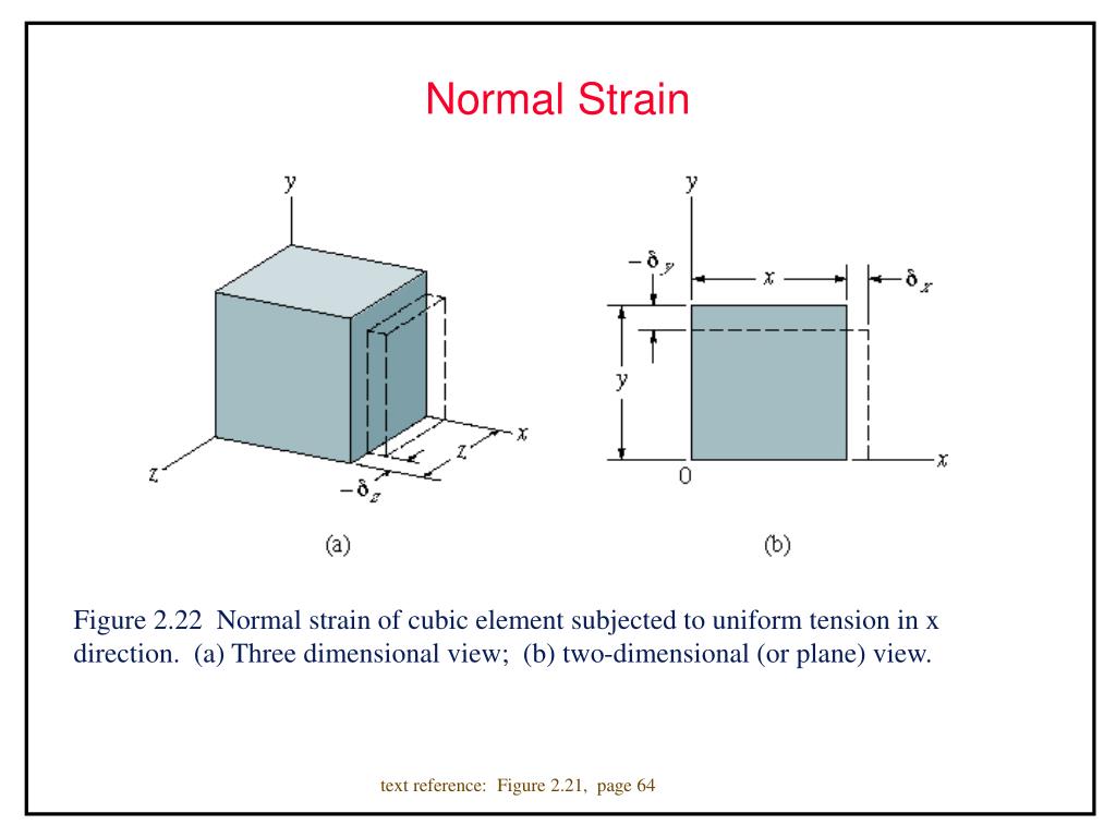 Normal Strain Figure 2.22 Normal strain of cubic element subjected to uniform tension in x direction. (a) Three dimensional view; (b) two-dimensional (or plane) view. text reference: Figure 2.21, page 64