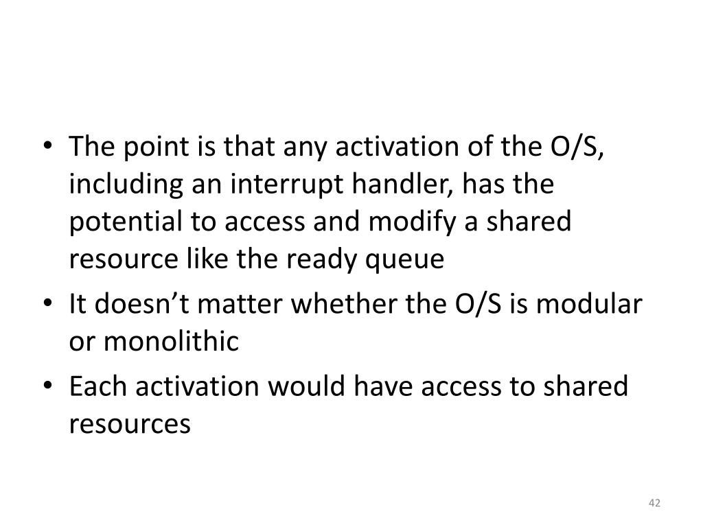 The point is that any activation of the O/S, including an interrupt handler, has the potential to access and modify a shared resource like the ready queue • It doesn’t matter whether the O/S is modular or monolithic • Each activation would have access to shared resources