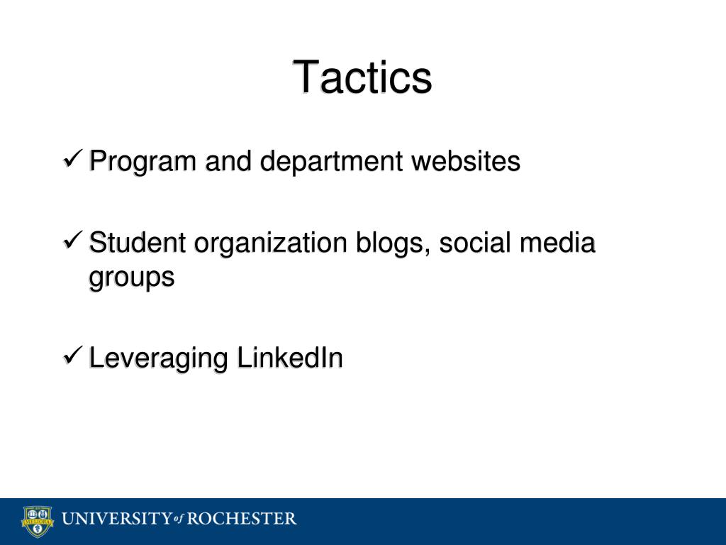 Tactics • Program and department websites • Student organization blogs, social media groups • Leveraging LinkedIn