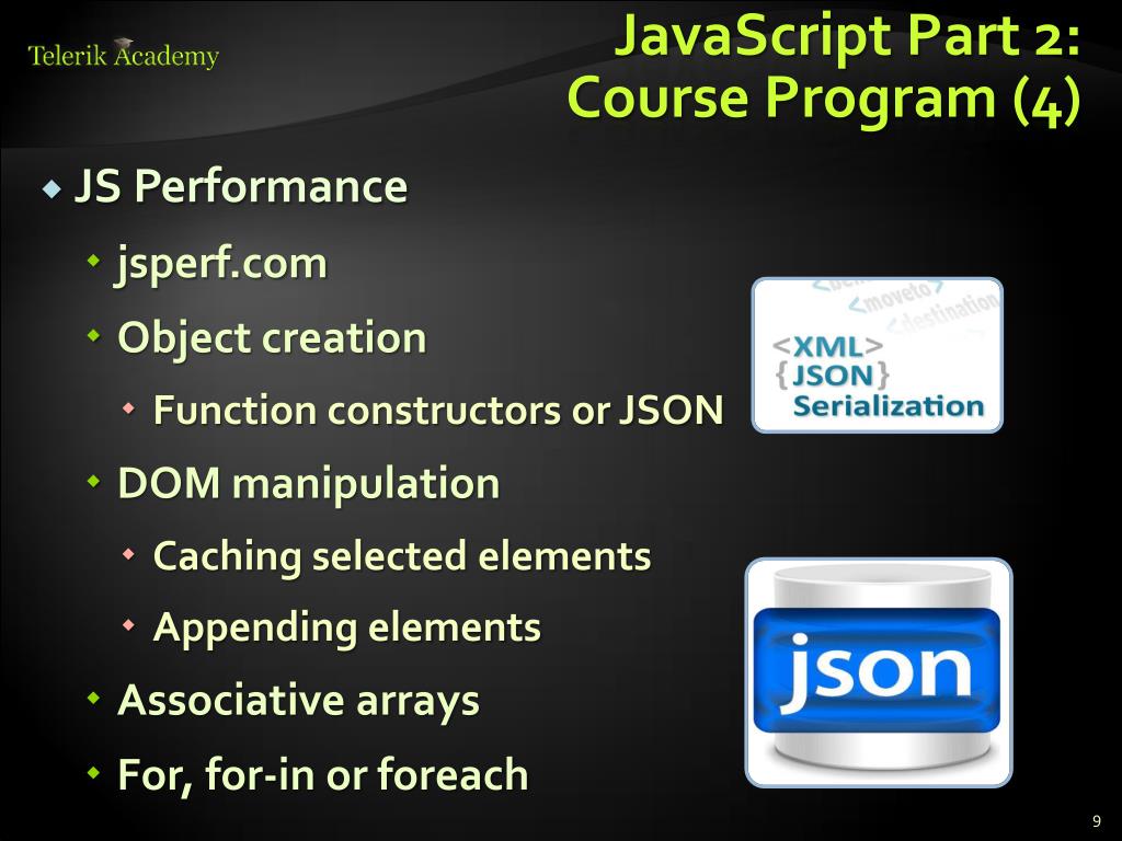 JavaScript Part 2: Course Program (4) • JS Performance • jsperf.com • Object creation • Function constructors or JSON • DOM manipulation • Caching selected elements • Appending elements • Associative arrays • For, for-in or foreach