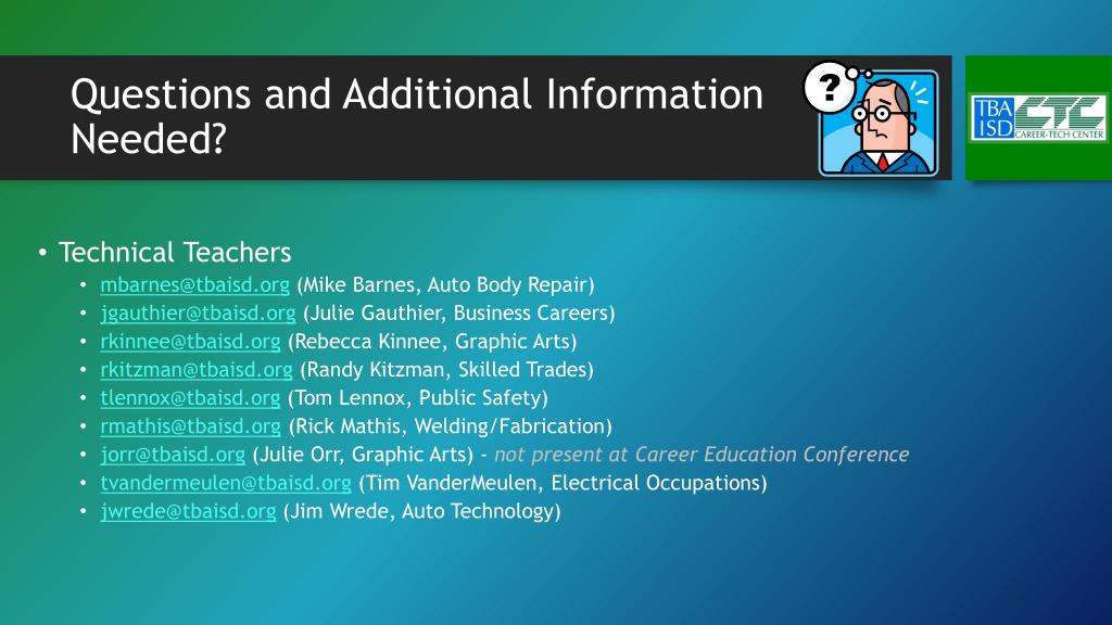 Questions and Additional Information Needed? • Technical Teachers • mbarnes@tbaisd.org (Mike Barnes, Auto Body Repair) • jgauthier@tbaisd.org (Julie Gauthier, Business Careers) • rkinnee@tbaisd.org (Rebecca Kinnee, Graphic Arts) • rkitzman@tbaisd.org (Randy Kitzman, Skilled Trades) • tlennox@tbaisd.org (Tom Lennox, Public Safety) • rmathis@tbaisd.org (Rick Mathis, Welding/Fabrication) • jorr@tbaisd.org (Julie Orr, Graphic Arts) - not present at Career Education Conference • tvandermeulen@tbaisd.org (Tim VanderMeulen, Electrical Occupations) • jwrede@tbaisd.org (Jim Wrede, Auto Technology)