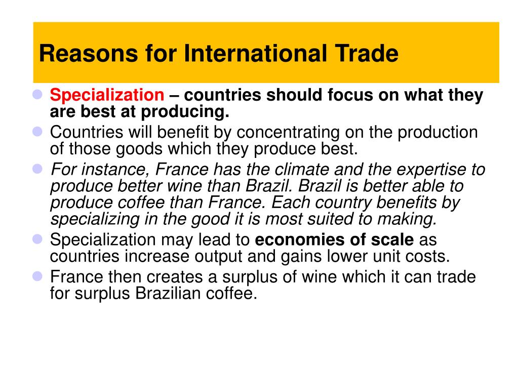 Reasons for International Trade • Specialization – countries should focus on what they are best at producing. • Countries will benefit by concentrating on the production of those goods which they produce best. • For instance, France has the climate and the expertise to produce better wine than Brazil. Brazil is better able to produce coffee than France. Each country benefits by specializing in the good it is most suited to making. • Specialization may lead to economies of scale as countries increase output and gains lower unit costs. • France then creates a surplus of wine which it can trade for surplus Brazilian coffee.