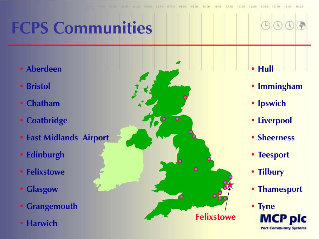 FCPS Communities • Aberdeen • Bristol • Chatham • Coatbridge • East Midlands Airport • Edinburgh • Felixstowe • Glasgow • Grangemouth • Harwich • Hull • Immingham • Ipswich • Liverpool • Sheerness • Teesport • Tilbury • Thamesport • Tyne Felixstowe