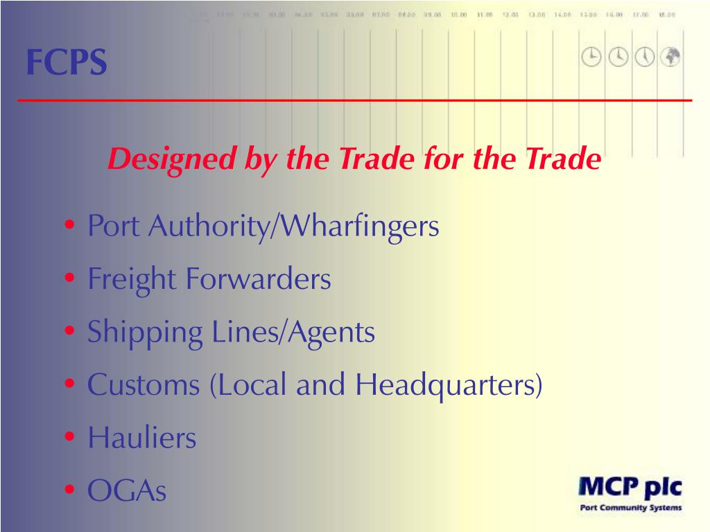 FCPS • Port Authority/Wharfingers • Freight Forwarders • Shipping Lines/Agents • Customs (Local and Headquarters) • Hauliers • OGAs Designed by the Trade for the Trade