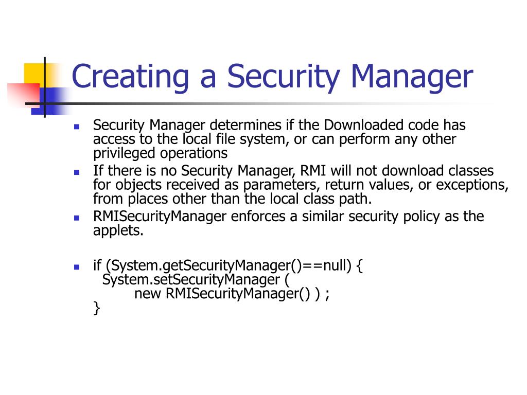 Creating a Security Manager • Security Manager determines if the Downloaded code has access to the local file system, or can perform any other privileged operations • If there is no Security Manager, RMI will not download classes for objects received as parameters, return values, or exceptions, from places other than the local class path. • RMISecurityManager enforces a similar security policy as the applets. • if (System.getSecurityManager()==null) { System.setSecurityManager ( new RMISecurityManager() ) ;}