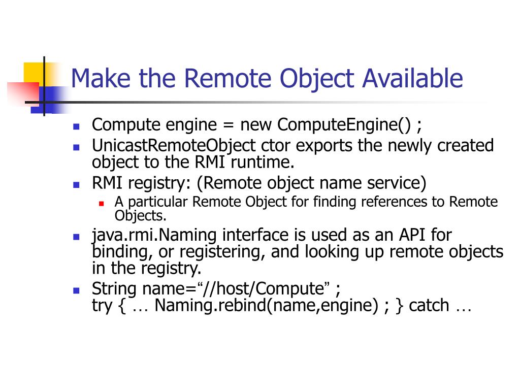 Make the Remote Object Available • Compute engine = new ComputeEngine() ; • UnicastRemoteObject ctor exports the newly created object to the RMI runtime. • RMI registry: (Remote object name service) • A particular Remote Object for finding references to Remote Objects. • java.rmi.Naming interface is used as an API for binding, or registering, and looking up remote objects in the registry. • String name=“//host/Compute” ;try { … Naming.rebind(name,engine) ; } catch …