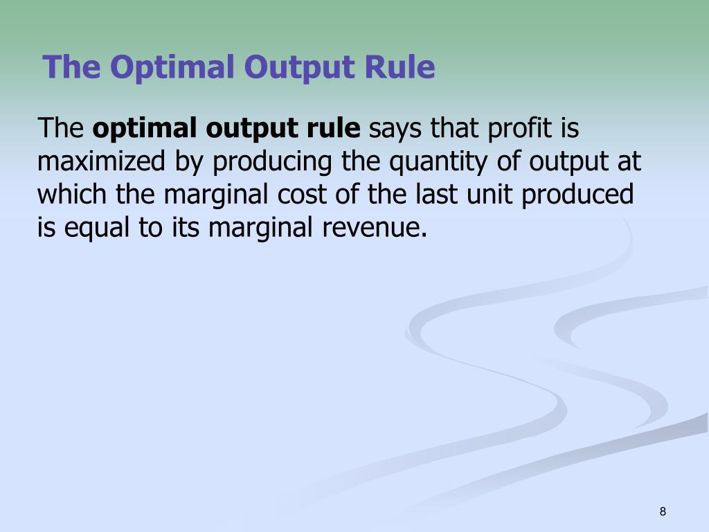 The Optimal Output Rule • The optimal output rule says that profit is maximized by producing the quantity of output at which the marginal cost of the last unit produced is equal to its marginal revenue.