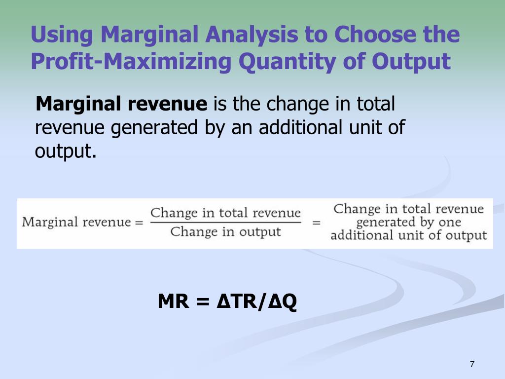 Using Marginal Analysis to Choose the Profit-Maximizing Quantity of Output • Marginal revenue is the change in total revenue generated by an additional unit of output. MR = ∆TR/∆Q