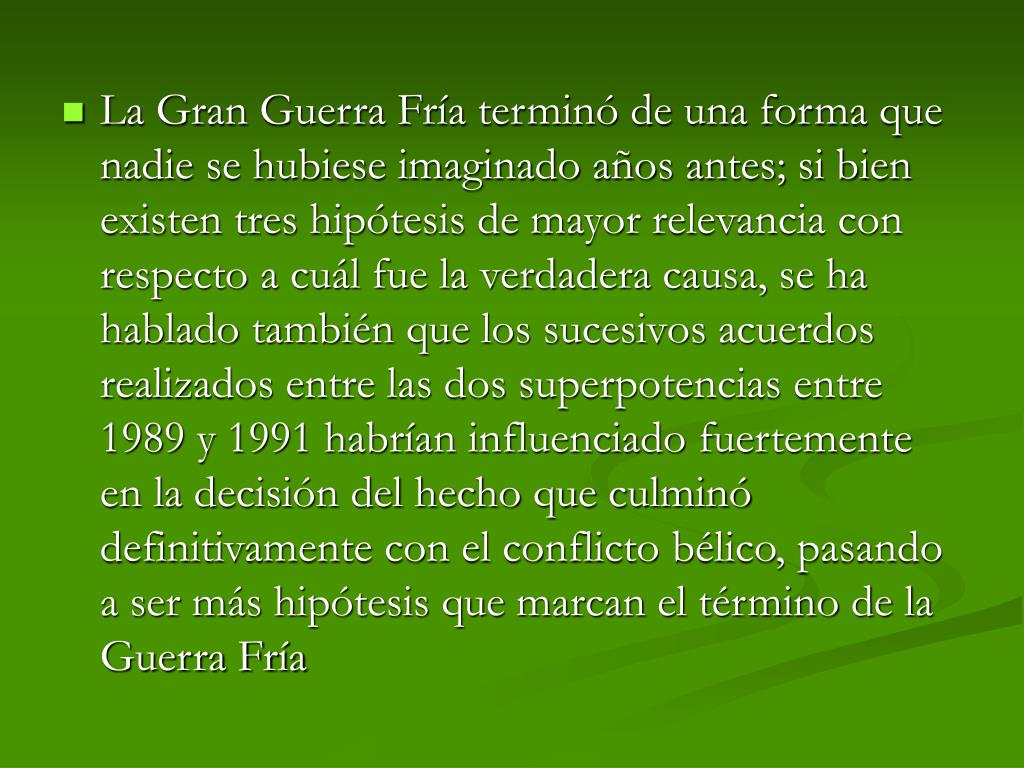 La Gran Guerra Fría terminó de una forma que nadie se hubiese imaginado años antes; si bien existen tres hipótesis de mayor relevancia con respecto a cuál fue la verdadera causa, se ha hablado también que los sucesivos acuerdos realizados entre las dos superpotencias entre 1989 y 1991 habrían influenciado fuertemente en la decisión del hecho que culminó definitivamente con el conflicto bélico, pasando a ser más hipótesis que marcan el término de la Guerra Fría