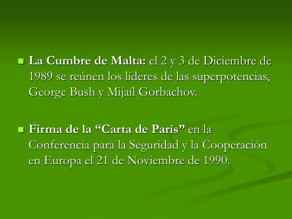 La Cumbre de Malta: el 2 y 3 de Diciembre de 1989 se reúnen los líderes de las superpotencias, George Bush y Mijaíl Gorbachov. • Firma de la “Carta de París” en la Conferencia para la Seguridad y la Cooperación en Europa el 21 de Noviembre de 1990.