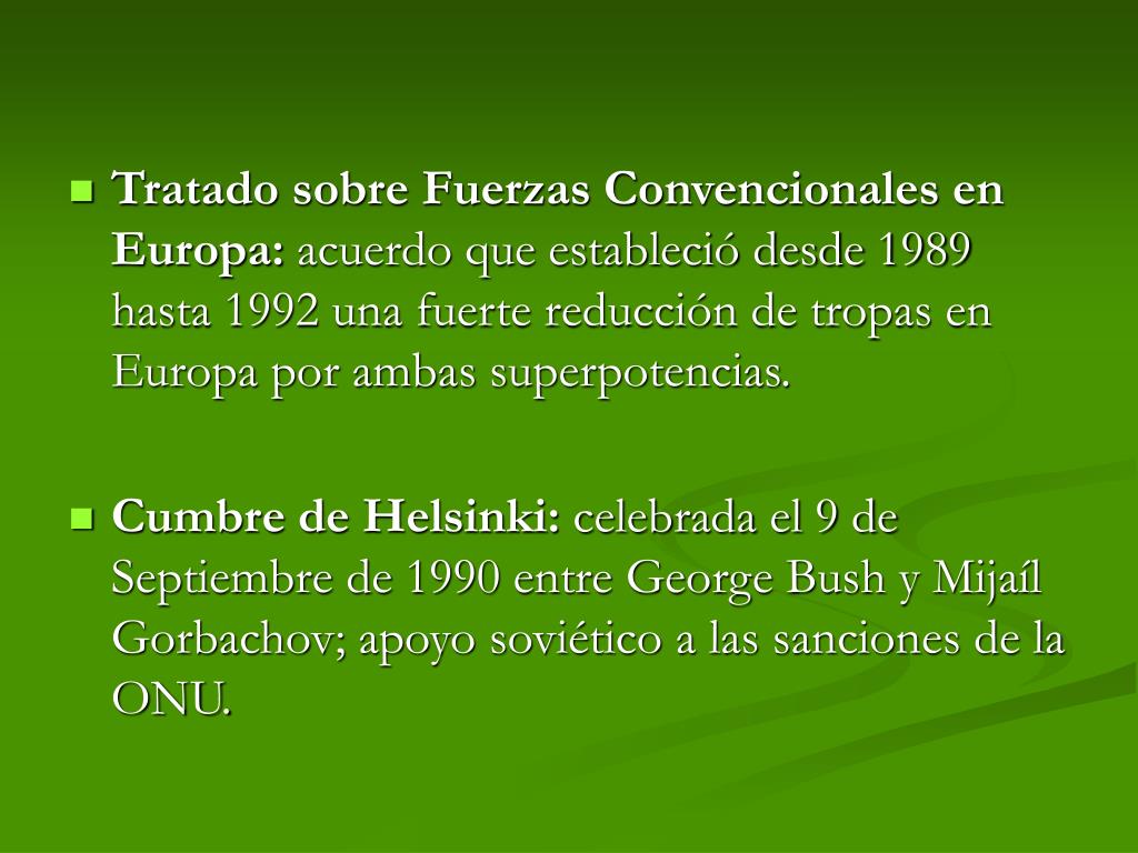 Tratado sobre Fuerzas Convencionales en Europa: acuerdo que estableció desde 1989 hasta 1992 una fuerte reducción de tropas en Europa por ambas superpotencias. • Cumbre de Helsinki: celebrada el 9 de Septiembre de 1990 entre George Bush y Mijaíl Gorbachov; apoyo soviético a las sanciones de la ONU.