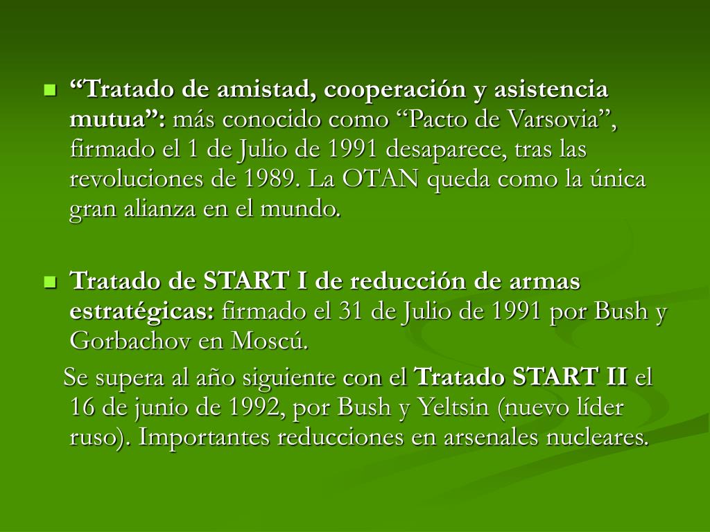 “Tratado de amistad, cooperación y asistencia mutua”: más conocido como “Pacto de Varsovia”, firmado el 1 de Julio de 1991 desaparece, tras las revoluciones de 1989. La OTAN queda como la única gran alianza en el mundo. • Tratado de START I de reducción de armas estratégicas: firmado el 31 de Julio de 1991 por Bush y Gorbachov en Moscú. Se supera al año siguiente con el Tratado START II el 16 de junio de 1992, por Bush y Yeltsin (nuevo líder ruso). Importantes reducciones en arsenales nucleares.