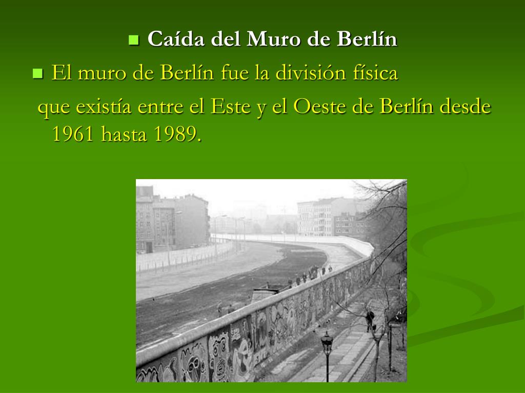Caída del Muro de Berlín • El muro de Berlín fue la división física que existía entre el Este y el Oeste de Berlín desde 1961 hasta 1989.