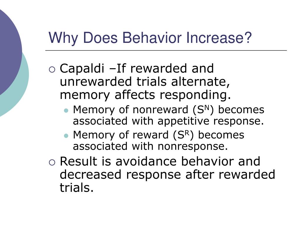 Why Does Behavior Increase? • Capaldi –If rewarded and unrewarded trials alternate, memory affects responding. • Memory of nonreward (SN) becomes associated with appetitive response. • Memory of reward (SR) becomes associated with nonresponse. • Result is avoidance behavior and decreased response after rewarded trials.